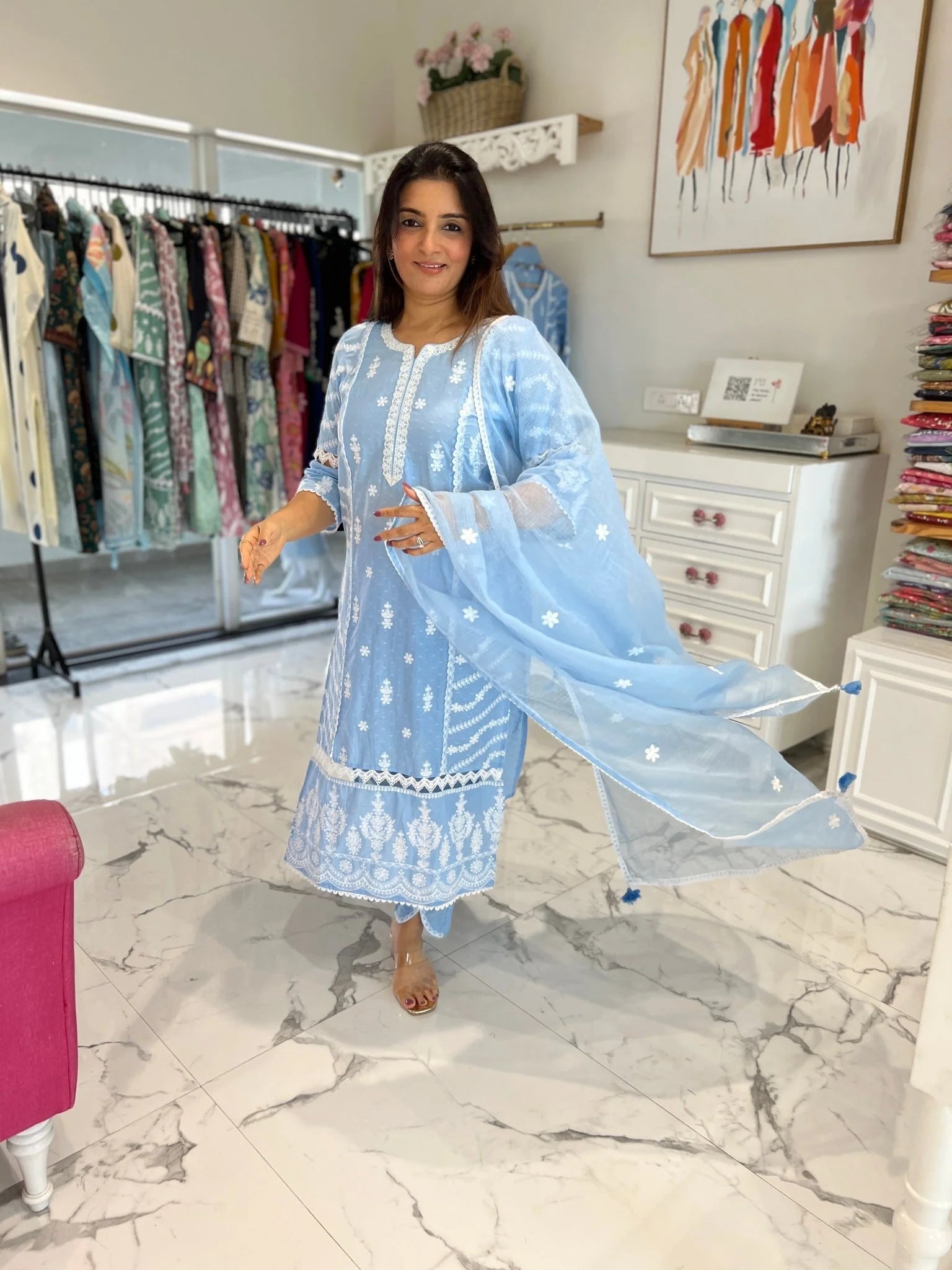 Powder Blue Ivory Embroidery Doriya Dupatta Set